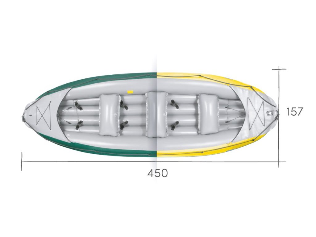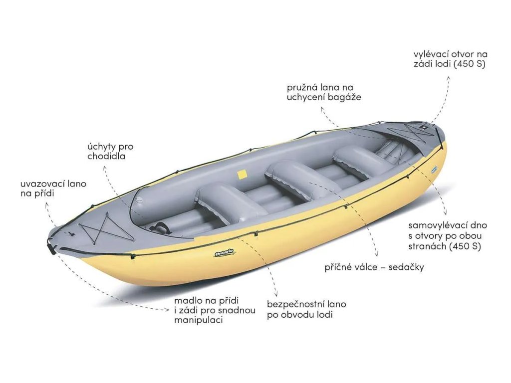 Ontario 450 S (450 × 157 cm, 30 kg, Tragfähigkeit 630 kg) istschnellstes mehrsitziges Boot hergestellt von Gumotex. Dankerweitertes Design aselbstlenzende Unterseite eignet sich nicht nur für entspannte Wanderungen, sondern auch für den aktiven Einsatz in den Stromschnellen bis WW3. Es zeichnet sich durch seine Geräumigkeit, hervorragende Stabilität und Manövrierfähigkeit aus.