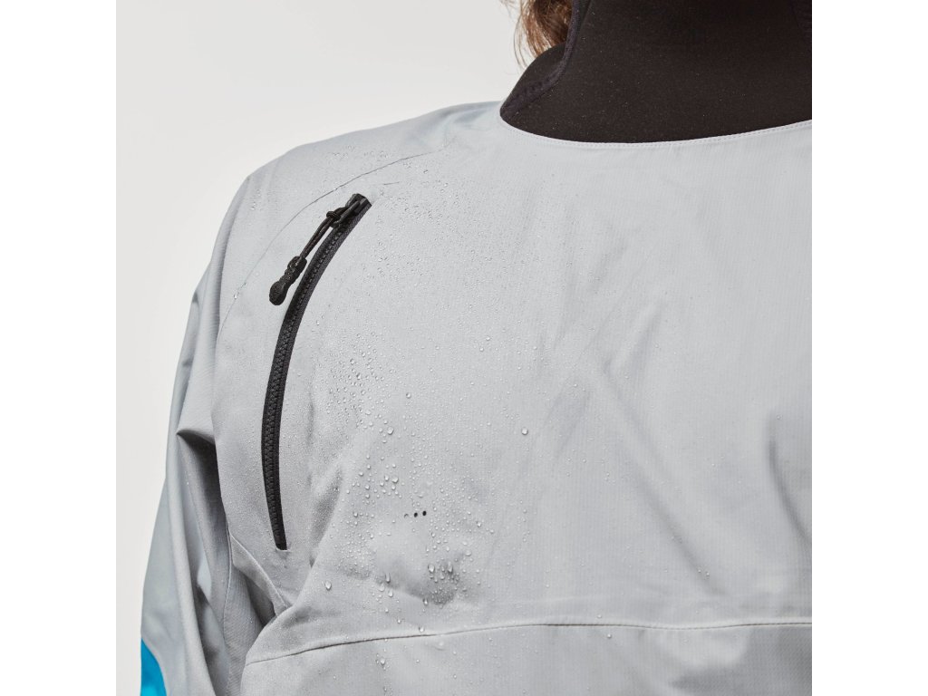 Die Jacke ist auf die Bedürfnisse von Paddlern abgestimmt. Die entspannte Passform ermöglicht Bewegungsfreiheit und einfaches Überziehen von Kleidung. Der GlideSkin™-Neoprenkragen bietet Komfort und Wasserschutz, während Latexmanschetten mit Neoprenüberzügen für eine komfortable Abdichtung sorgen und das Eindringen von Wasser minimieren. Eine Brusttasche mit wasserdichtem Reißverschluss bietet Stauraum für kleine Gegenstände.