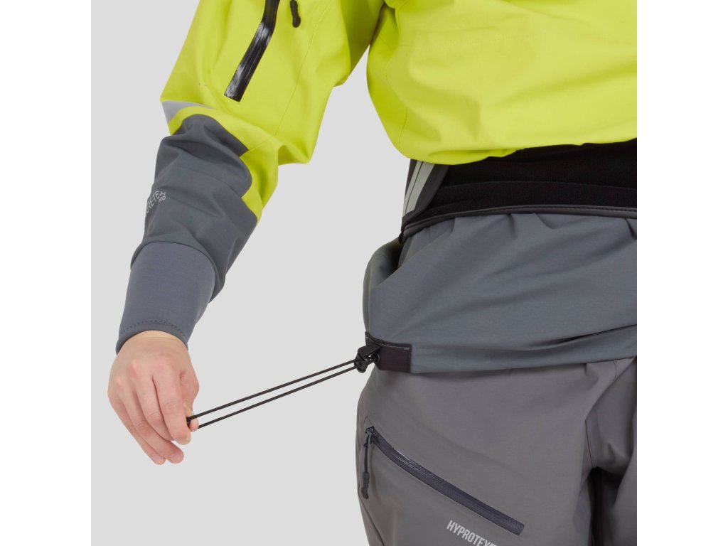 Die Jacke ist auf die Bedürfnisse aktiver Paddlerinnen abgestimmt. Die lockere Passform bietet Bewegungsfreiheit und ermöglicht das einfache Überziehen von Kleidung. Die anatomisch geformte Kapuze mit drei Bungee-Kordelzügen ermöglicht eine individuelle Anpassung und kann bei Nichtgebrauch einfach aufgerollt und gesichert werden. Ein doppelter Taillentunnel mit Klettverschlüssen ermöglicht die Verbindung mit der Kajakabdeckschürze und minimiert das Eindringen von Wasser in das Cockpit.