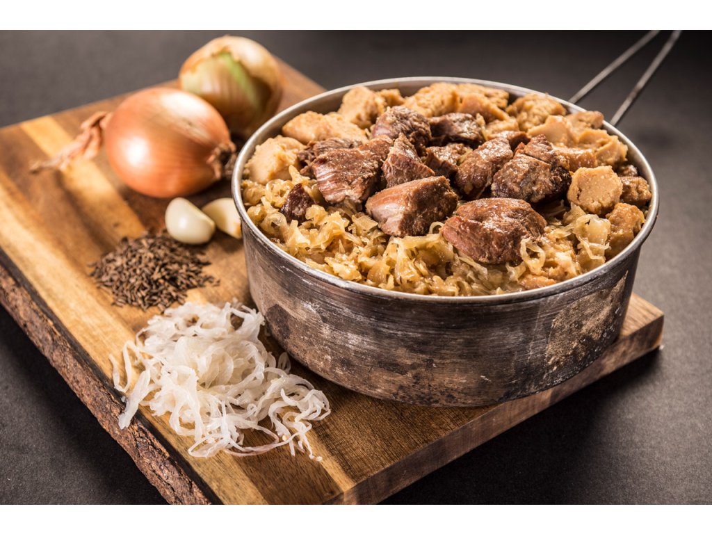 Pork shoulder (30%), potato wedges(28%) (wheat flour, potato flakes /SO2/, wheatsemolina, salt, egg mixture, spices), sauerkraut (26%)(cabbage, water, salt, cumin), rapeseed oil, onion, rice flour, corn flour, sugar, garlic, vinegar, salt, cumin, pepper.
