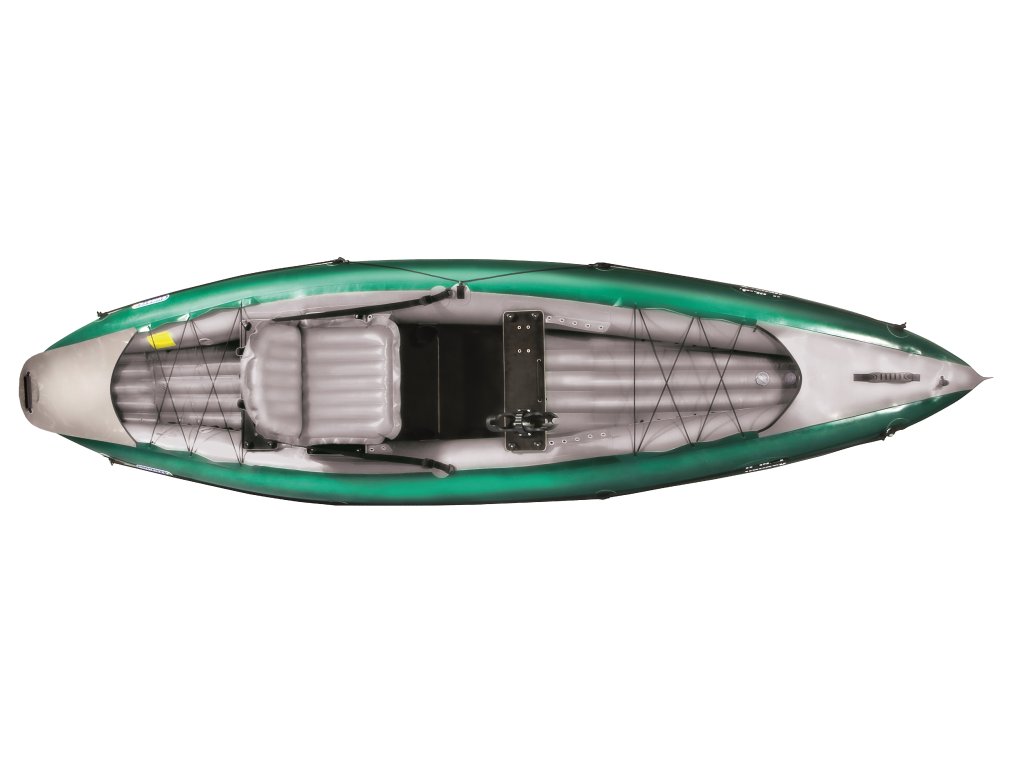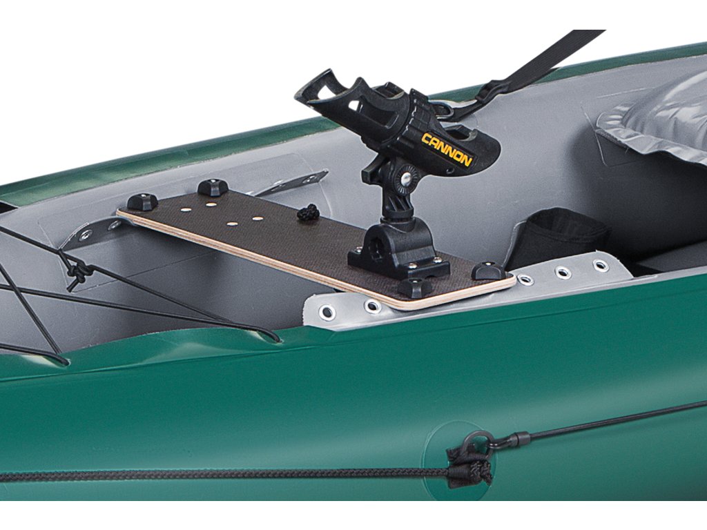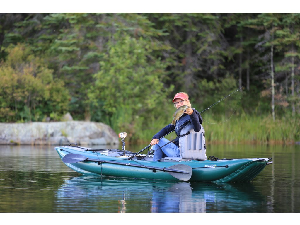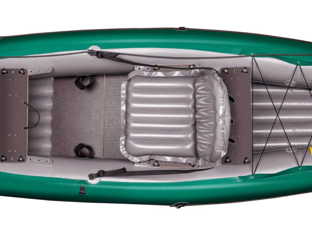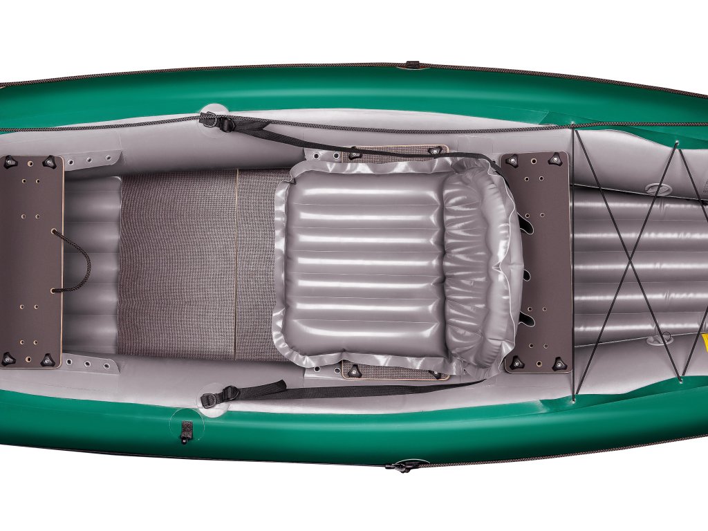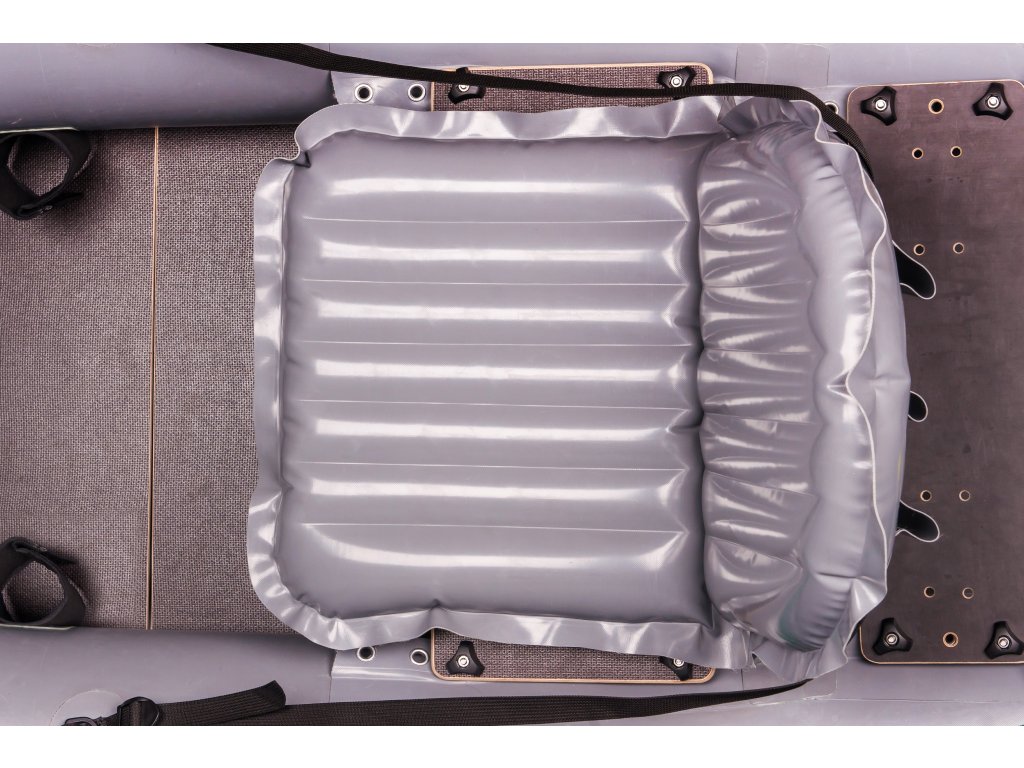 The kayak is equipped with a comfortable inflatable seat that is raised for better visibility and easy boarding. Practical handles and holders allow convenient storage of fishing equipment and accessories.
