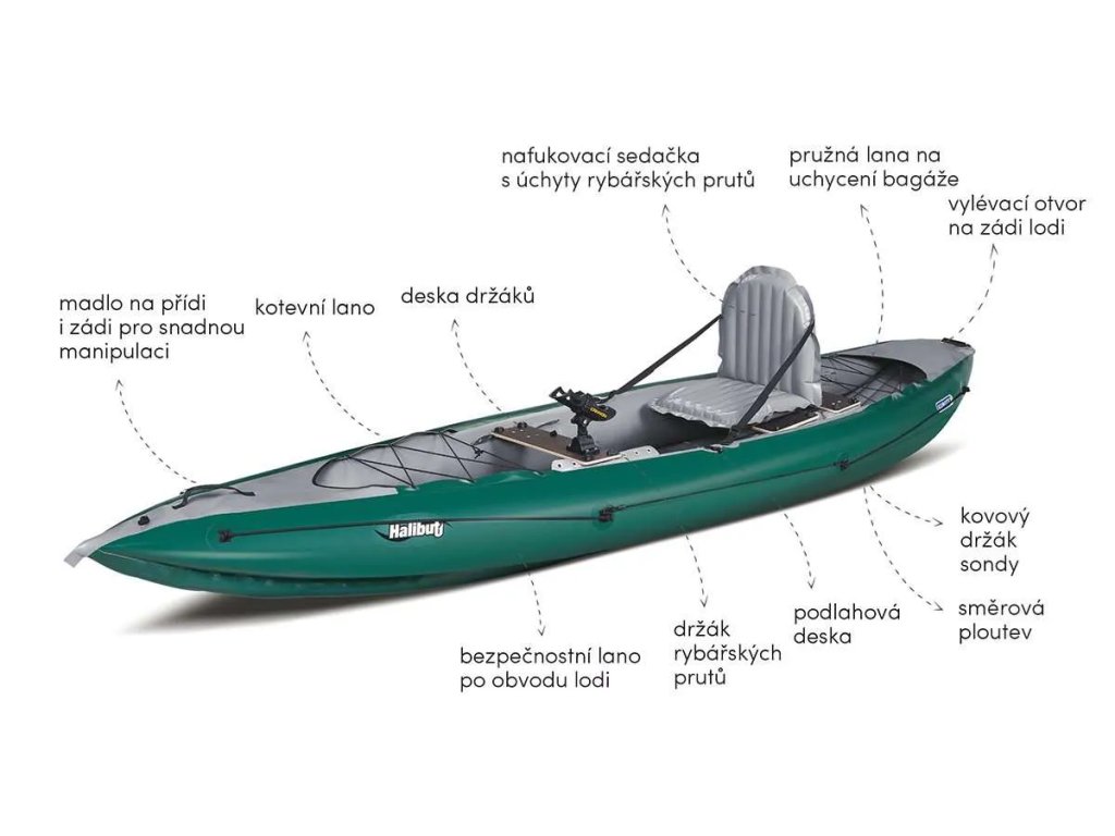Gumotex Halibut (375 × 96 cm, 21 kg, 200 kg capacity) is an inflatable fishing kayak with a solid floorboard, designed specifically for sport fishing on lakes, ponds and calm rivers. Its stability, manoeuvrability and sophisticated equipment make it the ideal choice for those who want to fish comfortably, safely and efficiently. Thanks to the high seat, it can also be fished standing up, which anglers will appreciate when casting and retrieving their catch. Features include a rod holder, probe grips and plenty of practical details for comfortable fishing and transport.