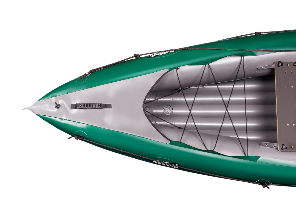 The Halibut is distinguished by its exceptional stability, which is ensured by the extra wide hull and flat floor plate. This not only allows for safe movement in the kayak, but also provides a firm enough surface for standing - ideal for stand-up fishing. A drain hole at the stern allows easy emptying of water. The combination of the directional fin and the bottom design ensures good manoeuvrability, which you will appreciate when positioning yourself on a fishing spot or when slowly cruising along the shore.