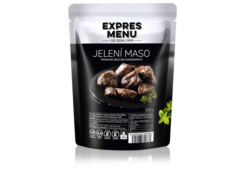 Kousky jeleního masa dušené doměkka ve vlastní šťávě, dochucené jen solí. Maso je chutné i za studena. Je vhodné pro rychlou přípravu pomazánek, polévek, omáček a salátů.