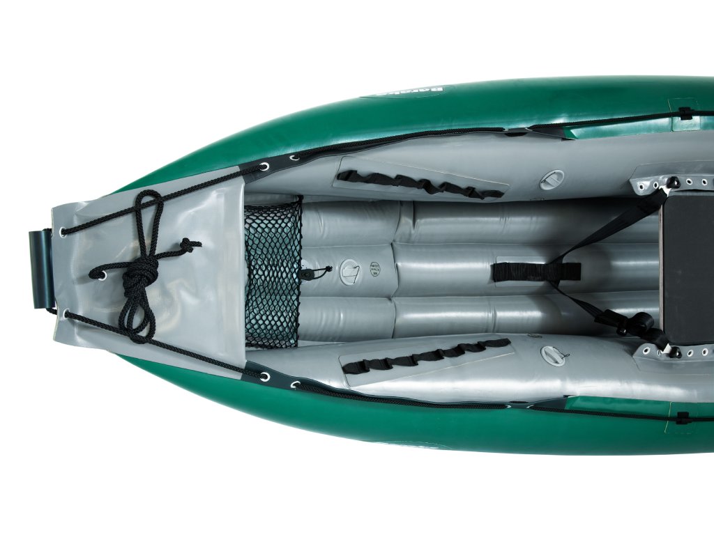 - Samovylévací dno s rolovacím uzávěrem, 2x dřevěná sedačka s polstrováním, nafukovací středová vzpěra, stehenní popruhy, transportní vak (135 l), přetlakový ventil, opravná sada.