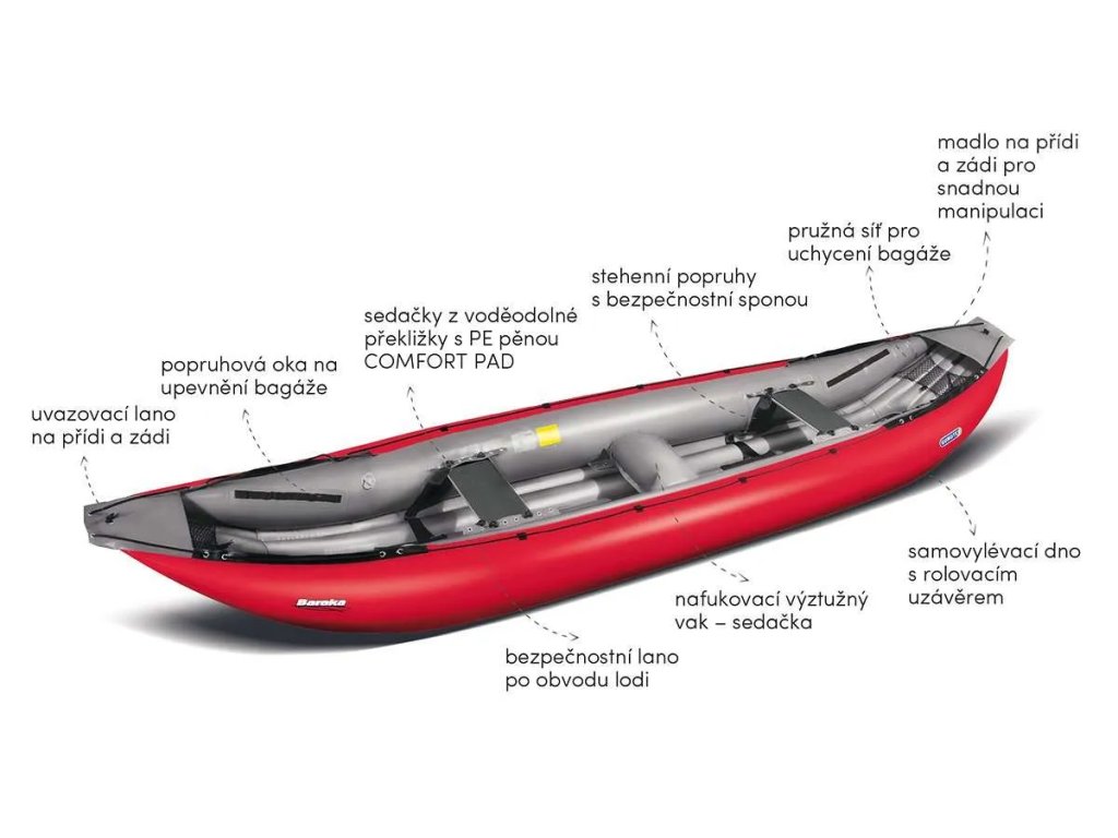 Tato nafukovací kánoe vyniká maximální stabilitou a pocitem bezpečí, díky čemuž ji řada uživatelů svými vlastnostmi přirovnává k „malému raftu“. Ať už se chystáte na svůj první víkendový sjezd, nebo hledáte spolehlivou loď do náročnějších peřejí, Baraka je navržena tak, aby obstála v širokém spektru podmínek.