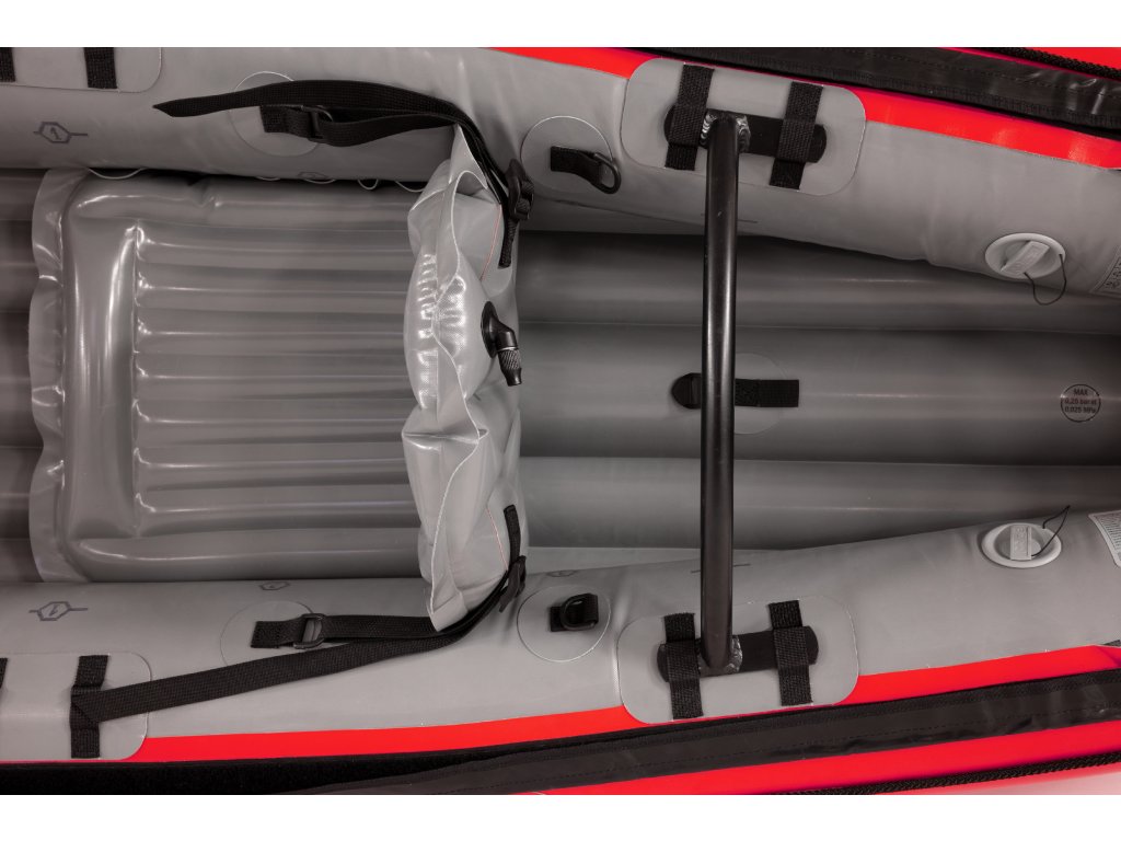 - Zpevnění paluby: Kovové výztuhy paluby (při použití kokpitu) roztahují boční válce od sebe, čímž zvyšují tuhost celé lodi a zlepšují její hydrodynamické vlastnosti.