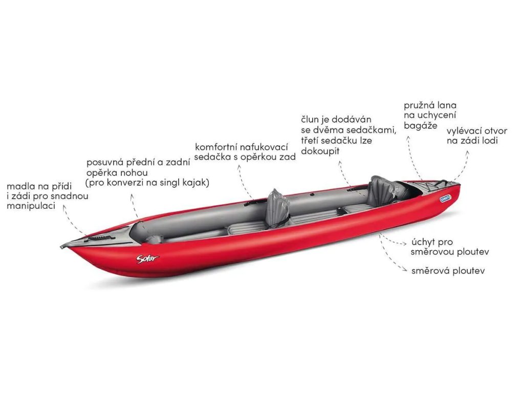 Konstrukce lodi Solar sází na osvědčený tříkomorový systém. Symetrický tvar a mírně zvednutá příď i záď zajišťují, že loď dobře klouže po hladině a nezapichuje se do drobných vln. Nízká poloha sedadel přispívá ke skvělé stabilitu celého plavidla, což minimalizuje riziko převržení a dodává pádlerům potřebnou jistotu.