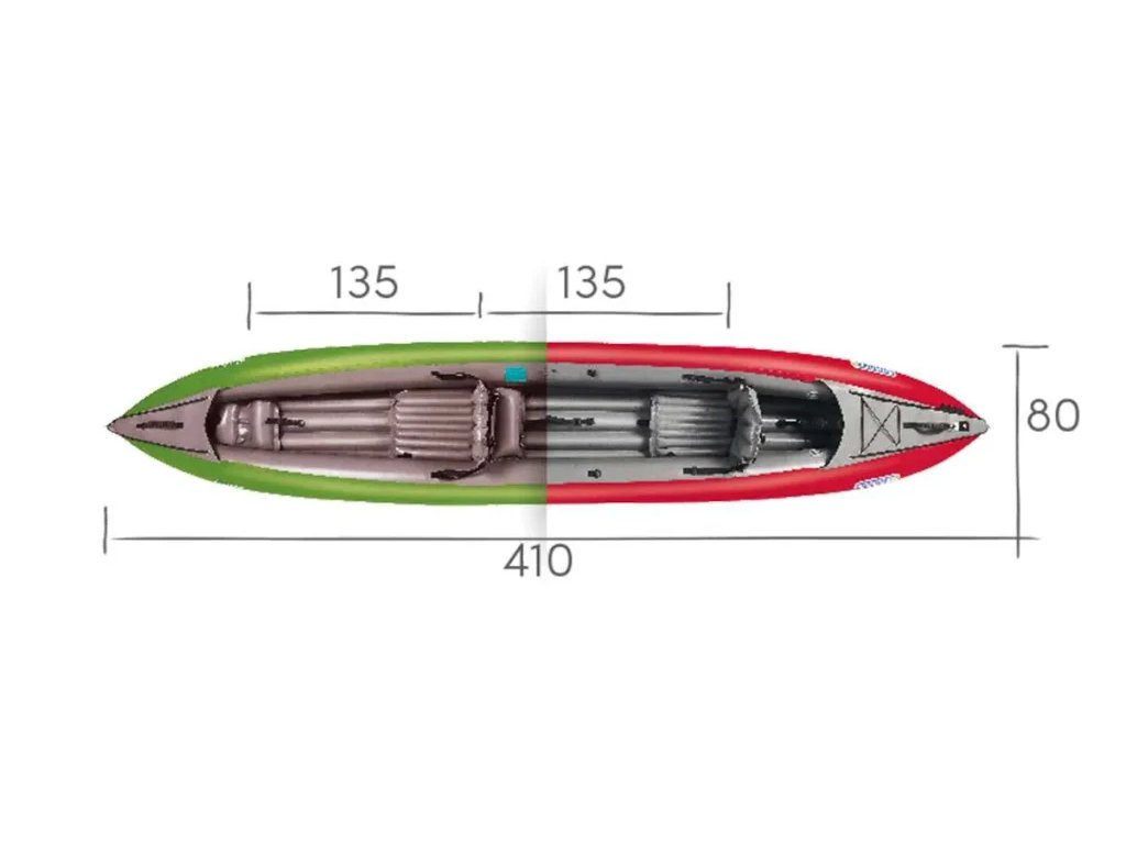 - Tandem: Klasická verze pro dva dospělé pádlaře s dostatkem místa pro nohy.