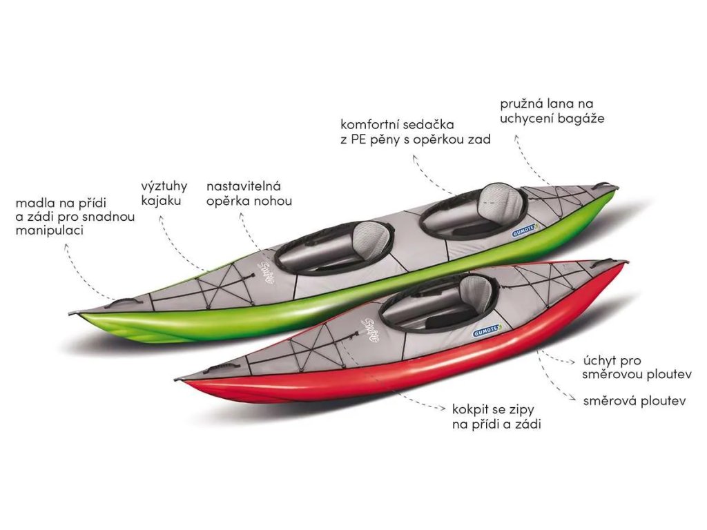 Gumotex Swing 2 (402 × 87 cm, 14,3 kg, teherbírás 220 kg) egy zárt, kétüléses kajak, amelyet szabadidős evezésre és túrázásra terveztek. Könnyű súlyának és stabil hajótestének köszönhetően olyan kevésbé tapasztalt evezősök számára is alkalmas, akik kényelmes, biztonságos és könnyen kezelhető csónakot keresnek a nyugodt folyókon, tavakon vagy tengeri öblökben tett kirándulásokhoz. A szerkezetben található megerősítések megfelelő merevséget és iránystabilitást biztosítanak, ami hozzájárul a kellemes menetérzethez még párosban is. Természetesen a könnyű kezelhetőség és a szállítótáskába való gyors bepakolás is magától értetődő.