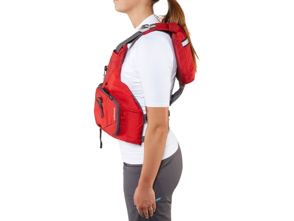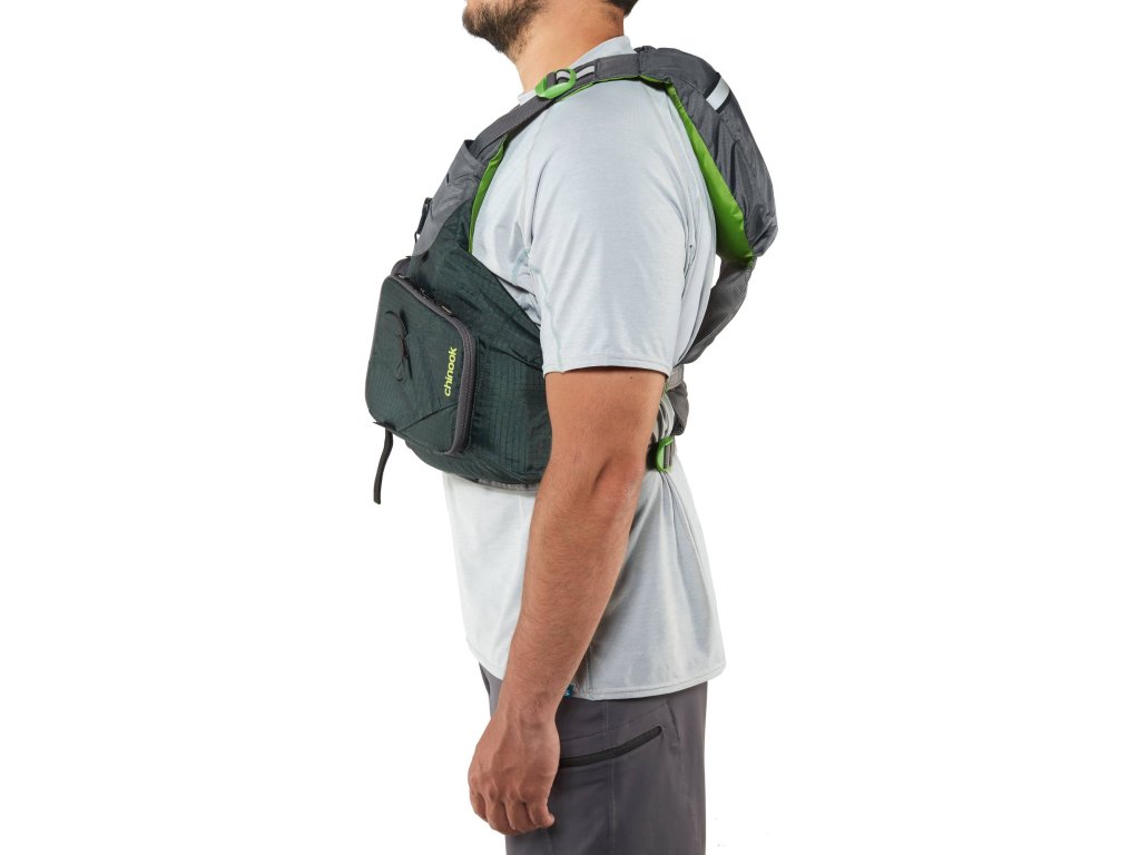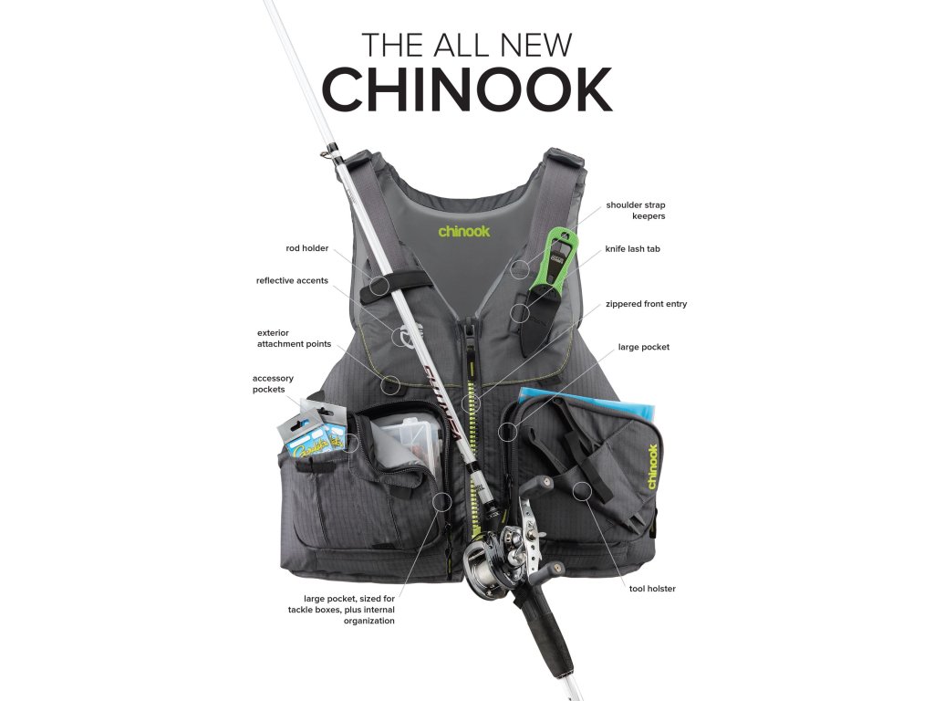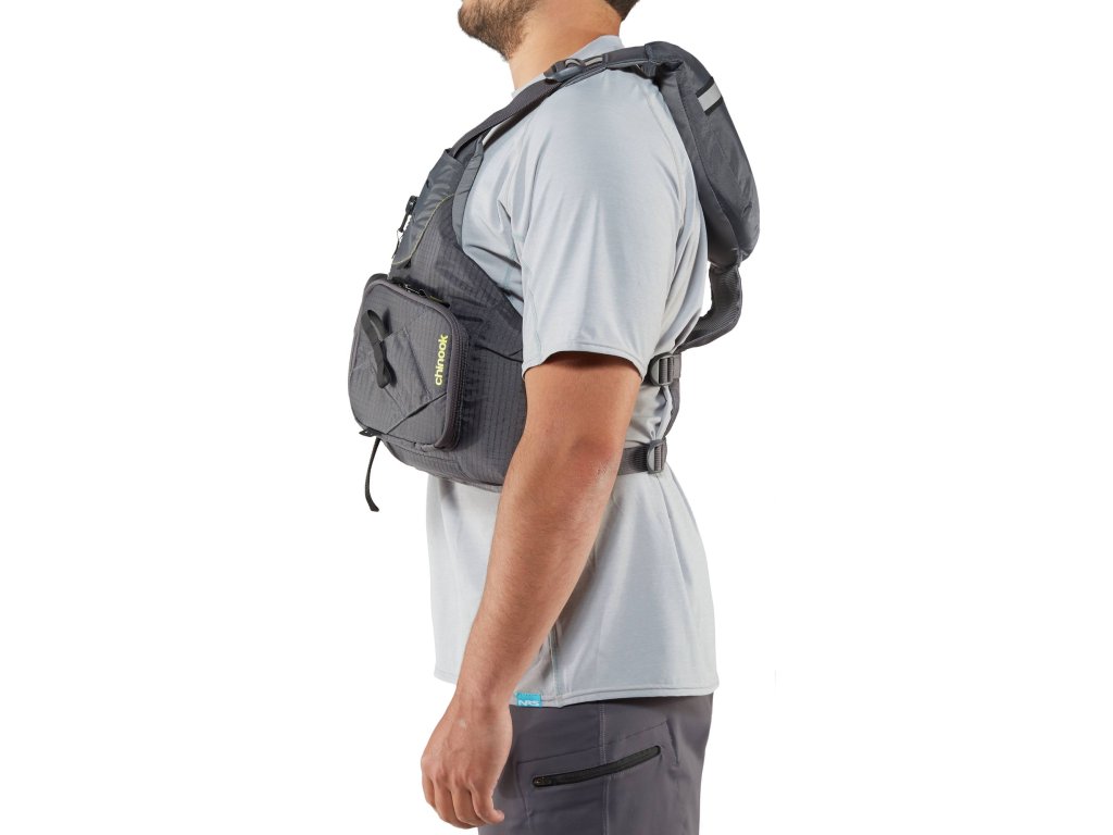 Chinook je navržena pro celodenní sezení v lodi i aktivní nahazování. Tenké boční panely a měkká pěna přirozeně obepínají trup a nepřekáží při rotaci. High-back tvar respektuje vysoké opěrky sedadel rybářských kajaků (i raftová sedadla), zatímco mesh v bederní oblasti zlepšuje odvod tepla a potu v parných dnech. Díky přednímu zipu je oblékání a odkládání otázkou sekund.