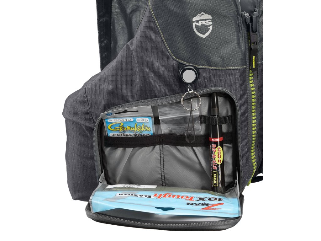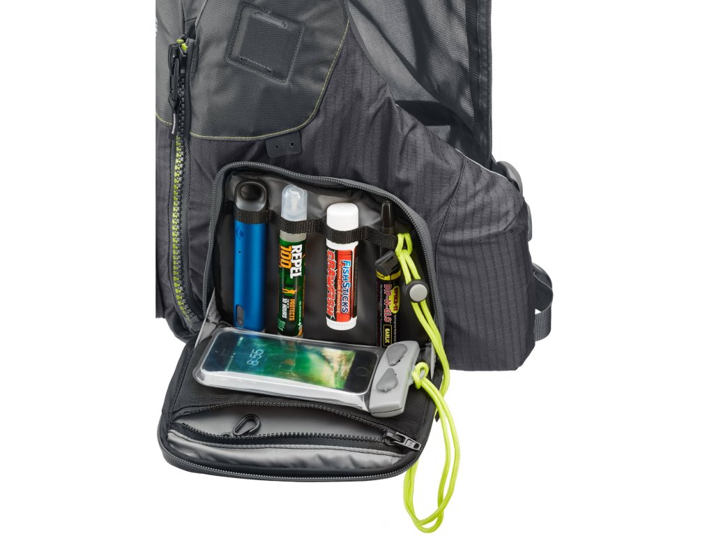 - Organizace pro rybáře: dvě velké zip kapsy na krabičky s vnitřní organizací + dvě menší příruční kapsy na suchý zip + pátá kapsa na nástroje.