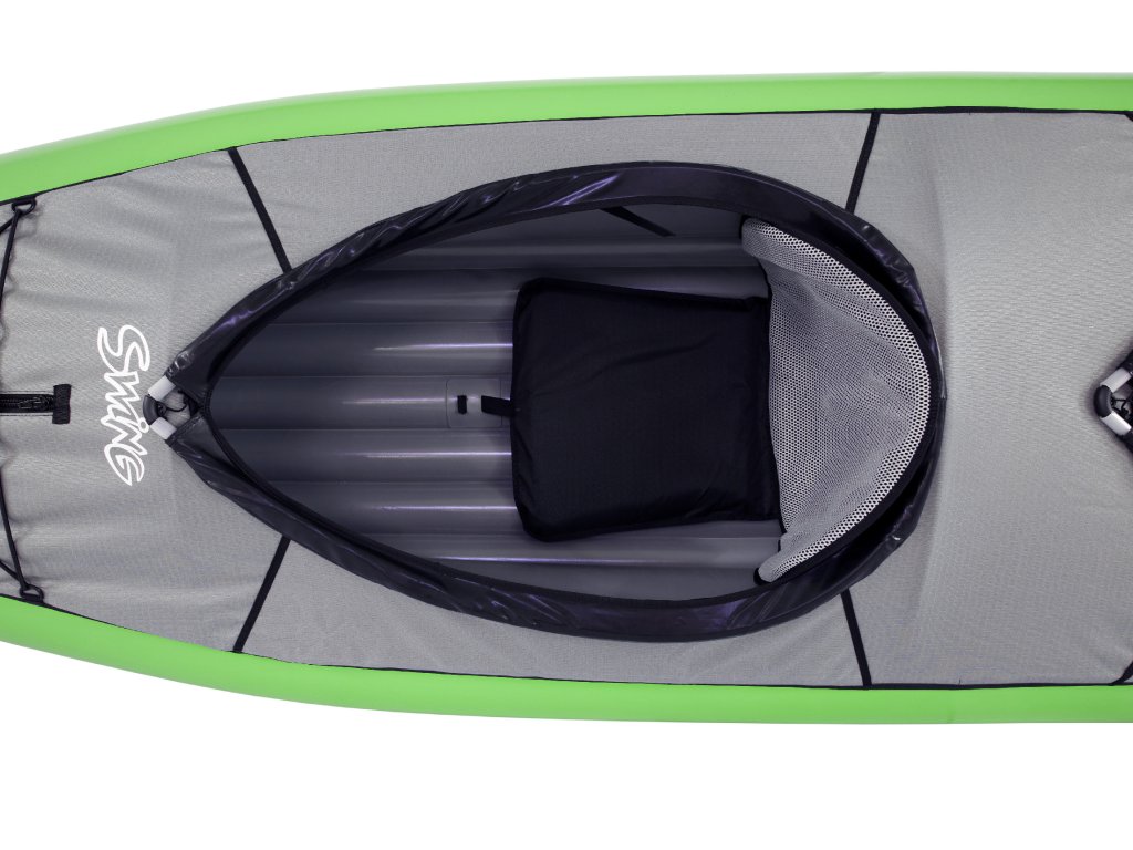Kadłub Swing 2 został zaprojektowany z myślą o stabilności i łatwej obsłudze. Szerokość 87 cm zapewnia łodzi niezbędną równowagę, a długość ponad 4 metrów zapewnia wystarczający poślizg nawet przy większych obciążeniach. Wzmocnienia w osi wzdłużnej kadłuba zapewniają niezbędną sztywność skrętną. Kajak jest wyposażony w uchwyt do płetwy kierunkowej, która pomaga utrzymać prosty kurs. Zamknięty kokpit z zamkami błyskawicznymi na dziobie i rufie zmniejsza opór powietrza i zapewnia ochronę przed bryzgami wody.