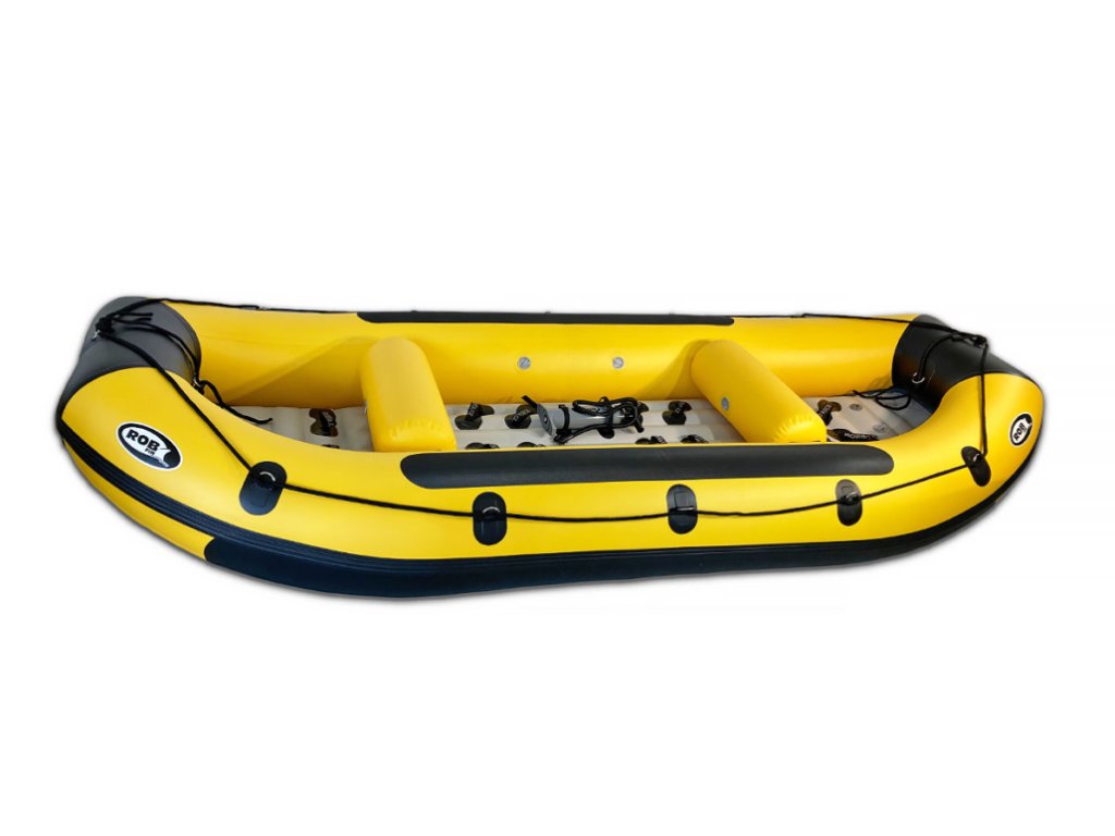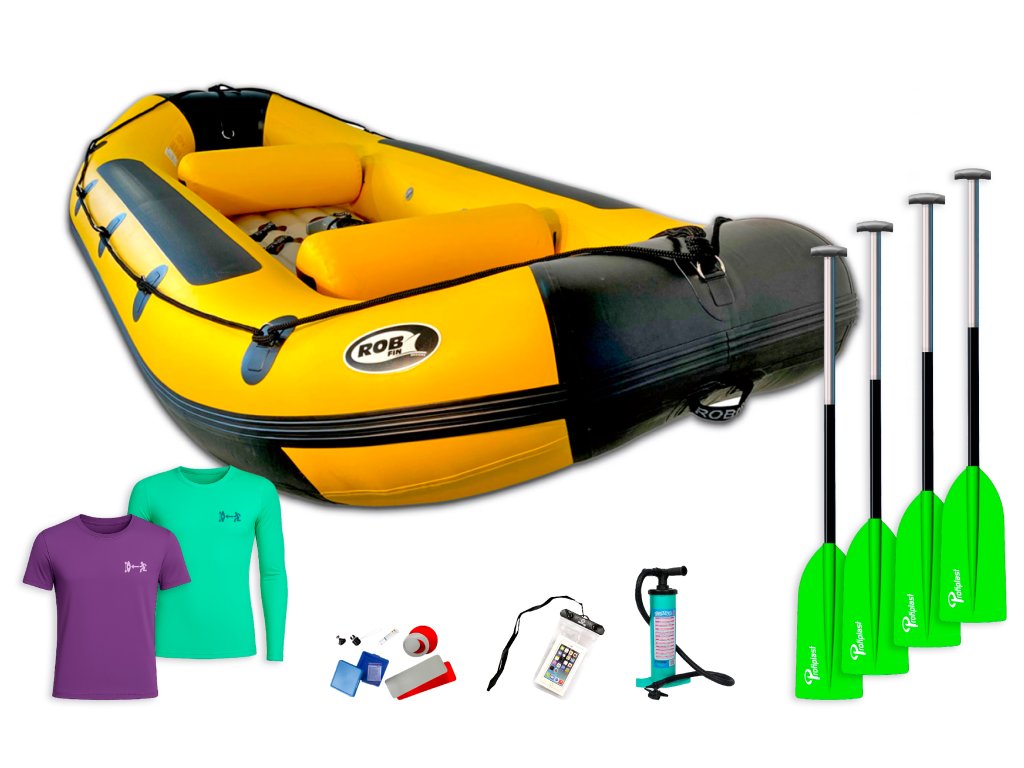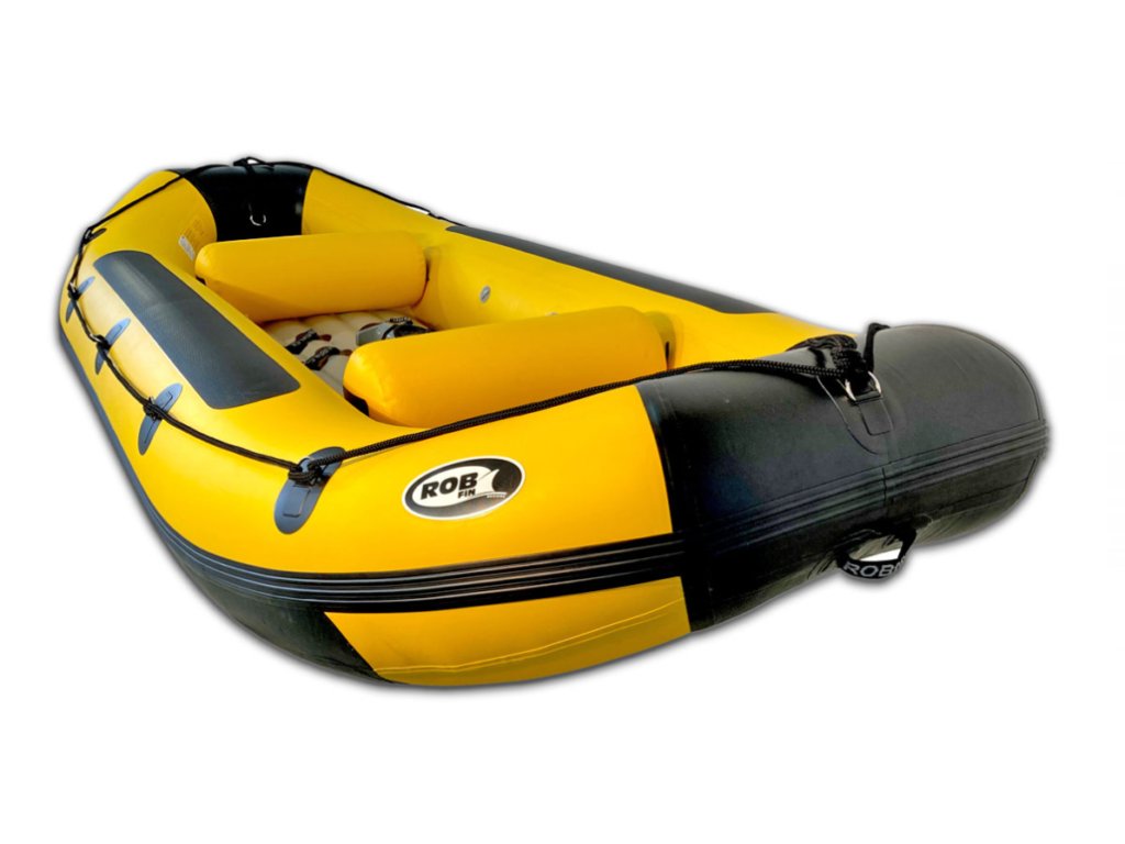 - Tratwa: ROBfin HOBIT 415 - siedmioosobowy przestronny ponton z samopływającym dnem i wzmocnieniami dna zapobiegającymi zanurzeniu.