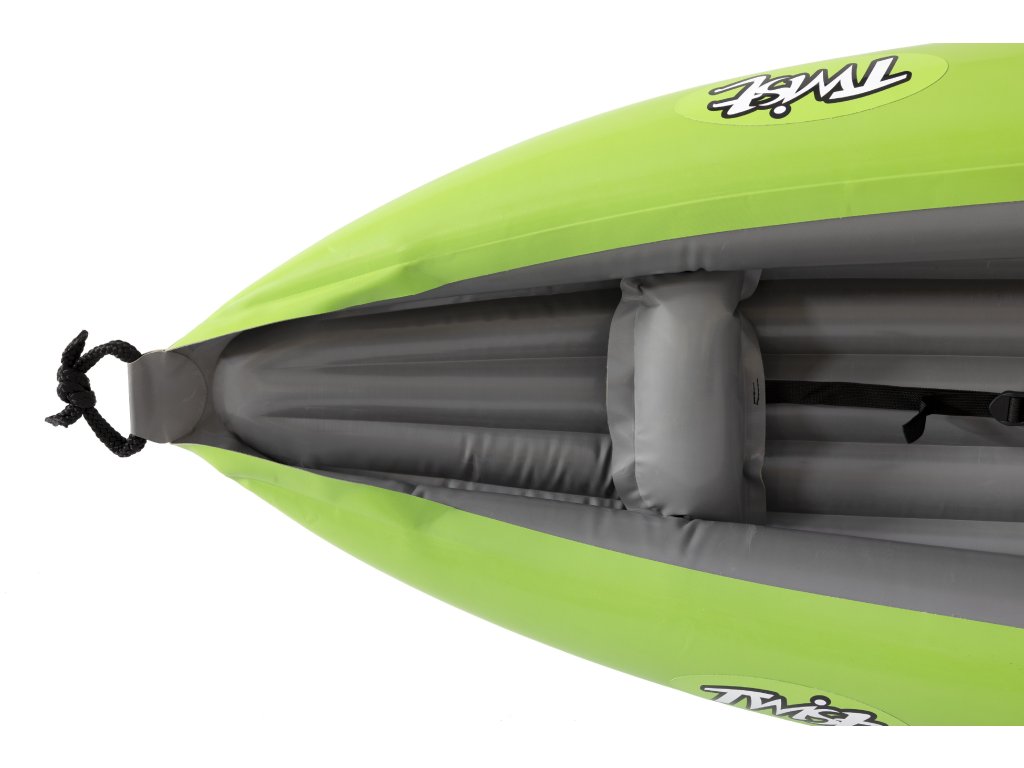 Twist 1 (260 × 79 cm, 7,4 kg, nosnosť 100 kg) je kompaktný jednomiestny nafukovací kajak určený na rekreačnú plavbu po jazerách a pokojných riekach. Vďaka stabilnému trupu, nízkemu profilu a smerovej plutve drží smer a ľahko sa ovláda. Pohodlné sedadlo s opierkou chrbta zaručuje pohodlie aj pri dlhších výletoch a viacstupňová opierka nôh umožňuje individuálne nastavenie. Vďaka nízkej hmotnosti sa ľahko prenáša a prepravuje.